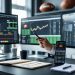 Seorang pria sedang duduk di meja kerja dengan beberapa perangkat digital menampilkan statistik dan data taruhan olahraga, di latar belakang layar besar menunjukkan pertandingan sepak bola langsung.